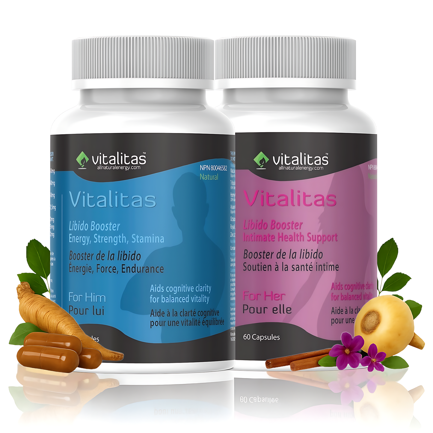 Regular price $74.95 USDThe perfect pair for passion and performance—Vitalitas Couple’s Bundle includes one bottle formulated for men and one for women. Made with a potent blend of herbal extracts and essential nutrients, this duo is designed to support strength, stamina, energy, and sexual vitality for both partners. Together, they help boost intimacy, balance, and overall well-being, so you can feel your best—inside and outside the bedroom. Third-party tested by Eurofins to ensure purity, safety, and consistent quality you can trust.